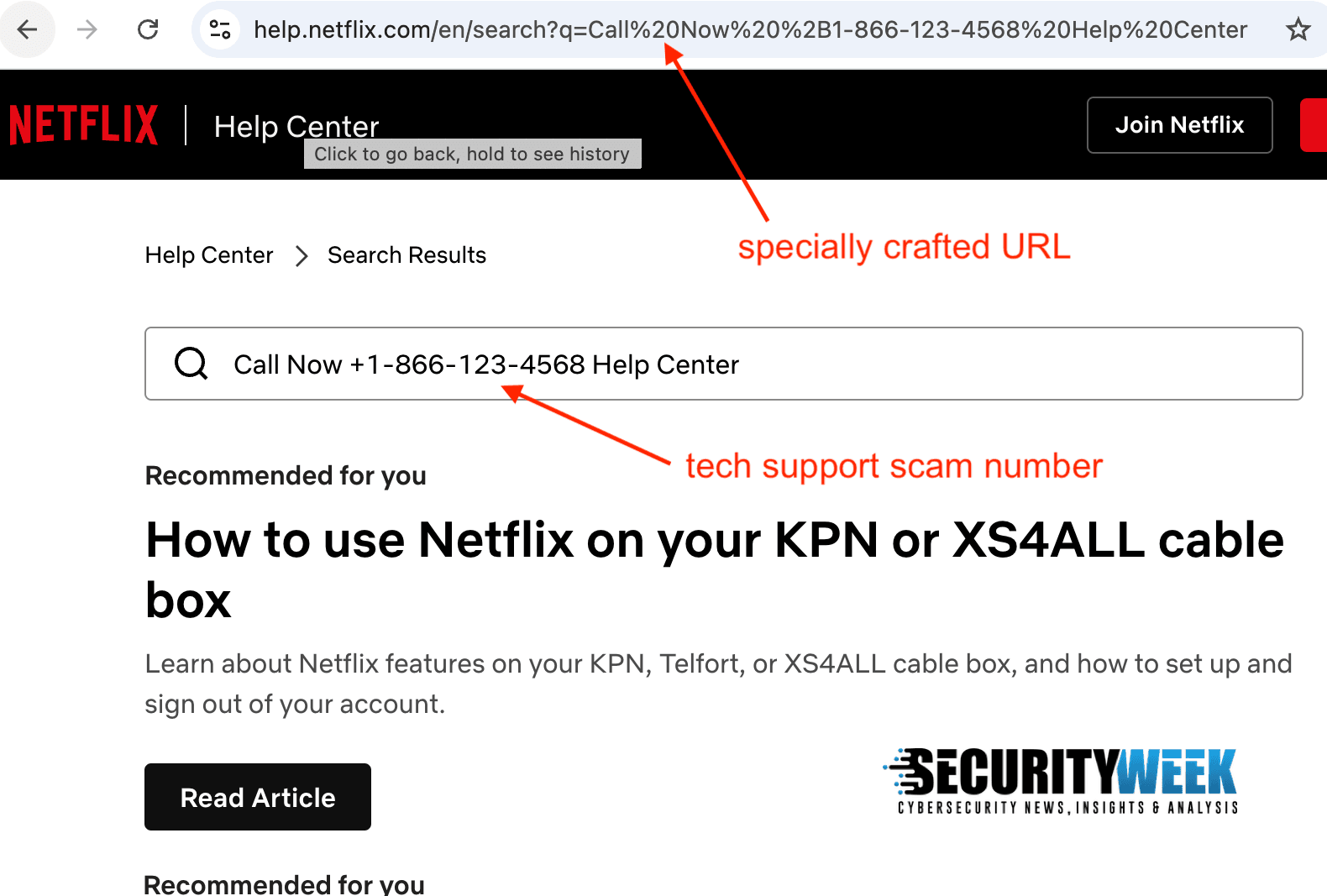 The URLs of these pages have been crafted in a way that triggers what Malwarebytes calls search parameter injection, causing the page to display the tech support scam phone number in the search bar or search results.