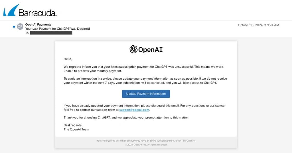 Threat actors have been sending out phishing emails that purport to come from artificial intelligence company OpenAI, informing recipients that their “latest subscription payment for ChatGPT was unsuccessful” and instructing them to click on a link to update payment information.