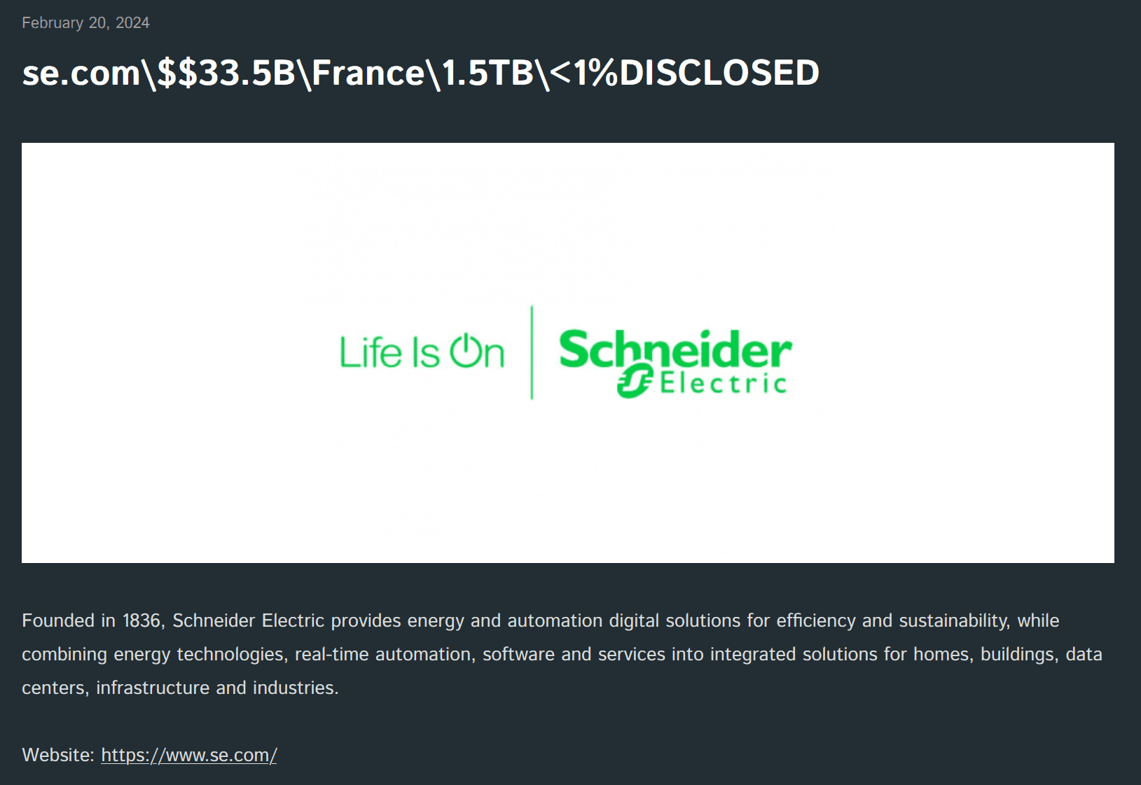 Schneider Electric’s Sustainability Business provides sustainability consulting services to large organizations worldwide, including Clorox, DHL, Hilton, and PepsiCo. However, it is unclear how many of these clients were affected by the incident.