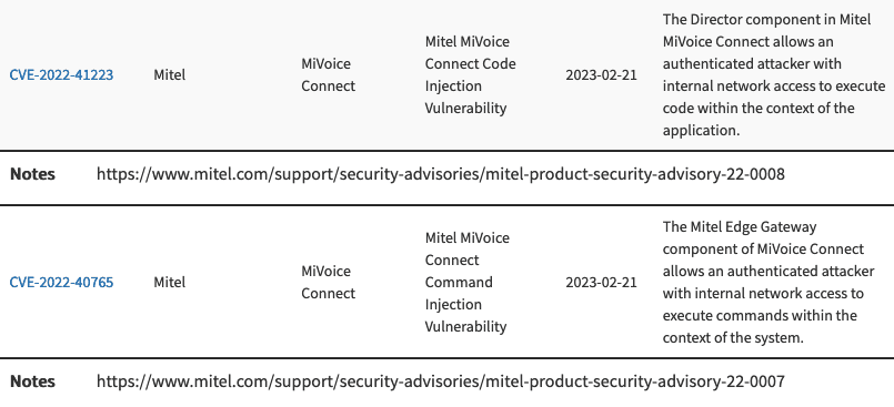 There does not appear to be any public information on the attacks exploiting CVE-2022-41223 and CVE-2022-40765, but CrowdStrike previously saw a Mitel MiVoice Connect flaw being exploited in the wild by cybercriminals.