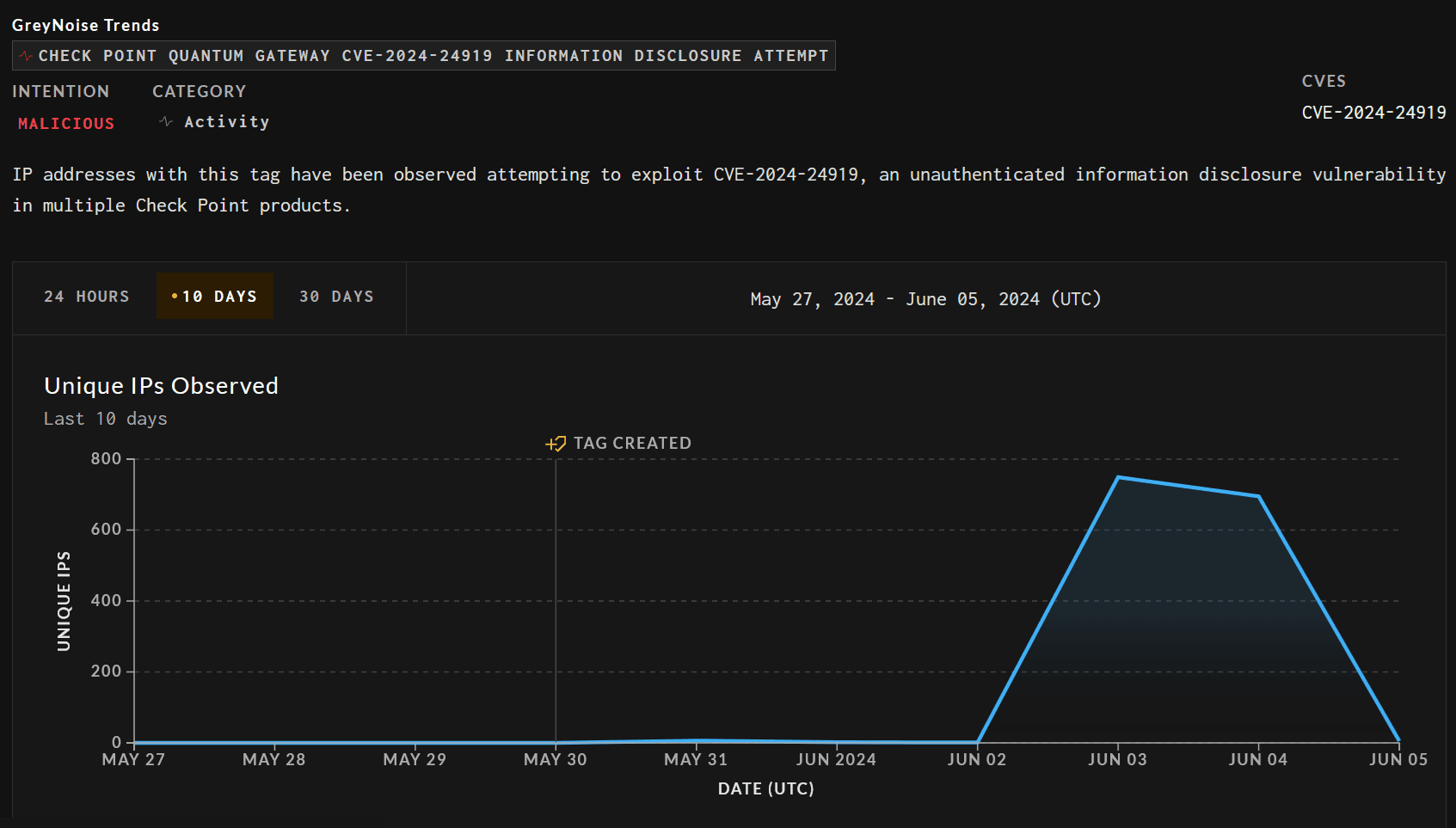 GreyNoise, which started tracking the bug shortly after Check Point’s public disclosure, says it has observed the first exploitation attempts on May 30, but with non-working payloads.