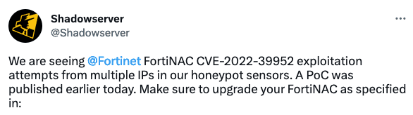 In-the-wild exploitation of a Fortinet FortiNAC vulnerability tracked as CVE-2022-39952 was seen just days after a patch was announced, and on the same day a proof-of-concept (PoC) exploit was made public.