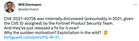 Based on its identifier, CVE-2021-42756 was discovered more than one year ago. It’s unclear why Fortinet has waited until now to patch it, but given its severity rating, some have speculated that potential exploitation in the wild could be a reason.
