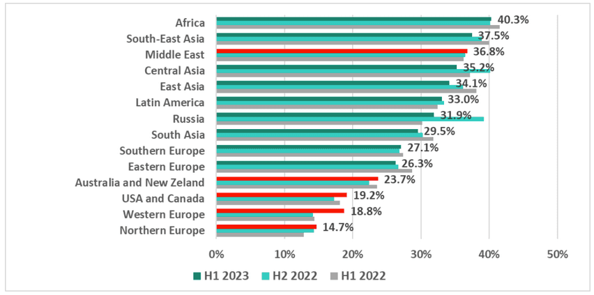 The biggest increase was seen in Western Europe, where the percentage of attacked ICS devices increased from 14.2% in H2 2022 to 18.8% in H1 2023.
