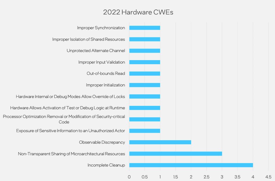 Intel has helped create a hardware common weakness enumeration (CWE) list and 19 of the hardware vulnerabilities addressed last year were assigned to 13 hardware CWEs.