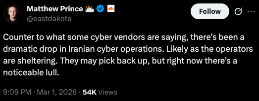 Sophos said on March 2 that it has seen “a surge in hacktivist activity, but not an escalation in risk, across Telegram, X, and underground forums following the February 28 strikes, primarily from pro-Iran personas including Handala Hack team and APTIran.”