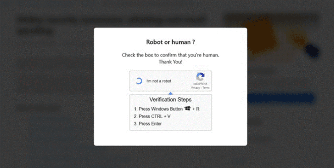 In the ClickFix technique, the attacker’s website displays an error or verification process that the user needs to address. The user is instructed to copy something that is not shown on the screen and then paste it into a Windows terminal and execute it.