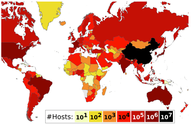 A majority of the vulnerable hosts were discovered in China, followed by France.