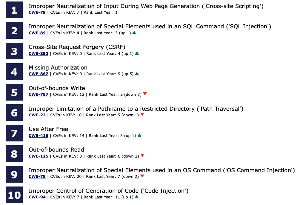 Missing authorization landed fourth in the 2025 CWE Top 25 list, up five positions. Out-of-bounds write placed fifth, dropping two places.