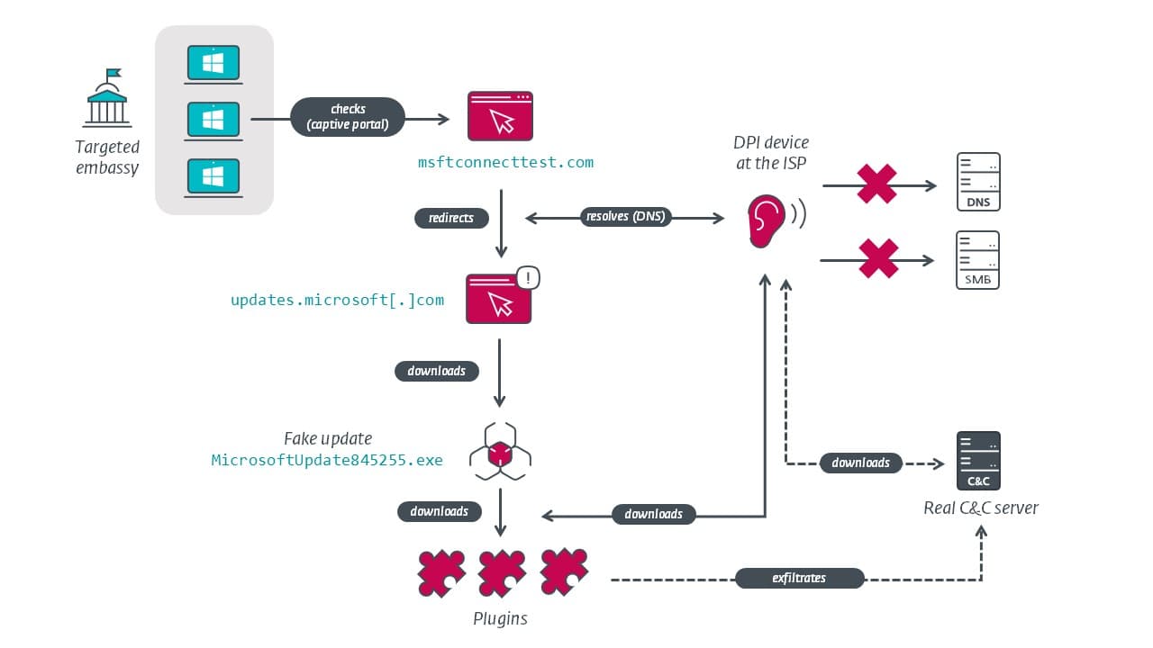 ESET noted that it cannot completely rule out the possibility that the AitM attacks were launched using compromised routers within the targeted embassies, but these lawful interception capabilities make it more likely that the attacks are being conducted at ISP level.