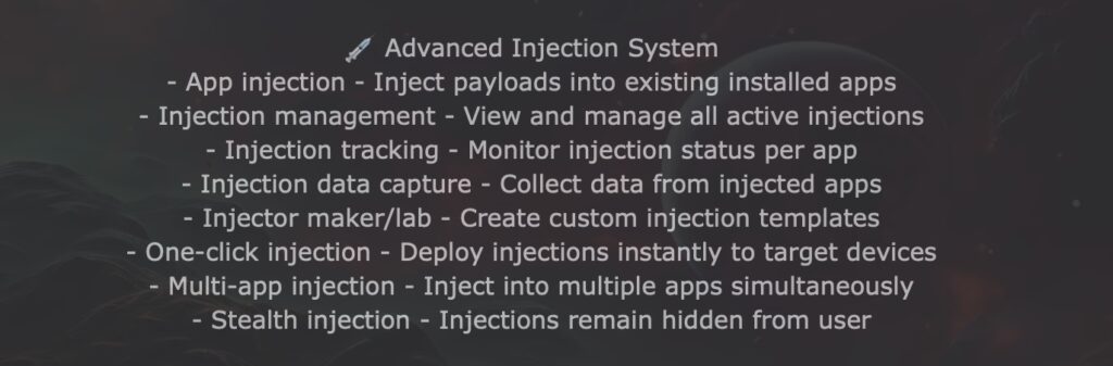 Cellik can also display overlays on top of other applications, such as fake login screens that intercept credentials. It comes with an injector lab for building custom injections targeting different applications, and supports multiple simultaneous injections across applications.