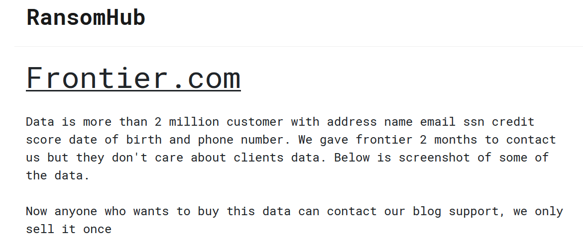 While the company shared no additional information on the number of potentially affected individuals, the RansomHub gang added Frontier on its leak site over the weekend, claiming to have stolen 5GB of data from the company.