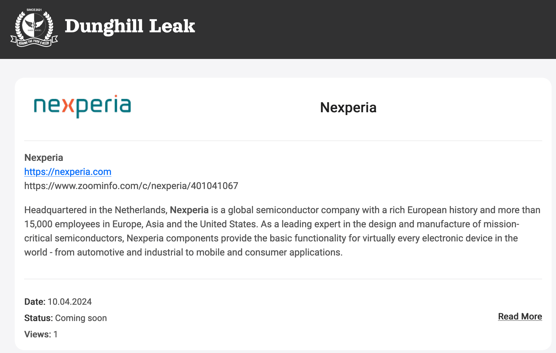 The ransomware group named Dark Angels (aka Dunghill) announced on its Tor-based website on April 10 that it had stolen 1 Tb of data from Nexperia.
