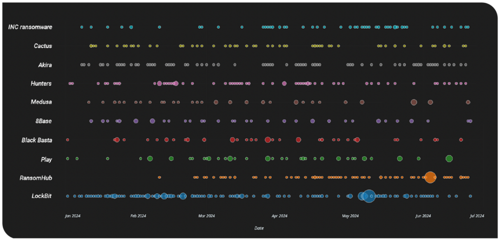 The report provides a fascinating and illuminating graph of group leak posts from the ten most active ransomware groups from the beginning of January 2024 to the end of June 2024.