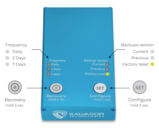 If the system becomes inoperable due to ransomware or another type of attack, the user simply restarts the device and boots it from the Salvador gadget, which restores the system to a previous state. Backups can be automatically made daily or at 2-day or 7-day intervals.