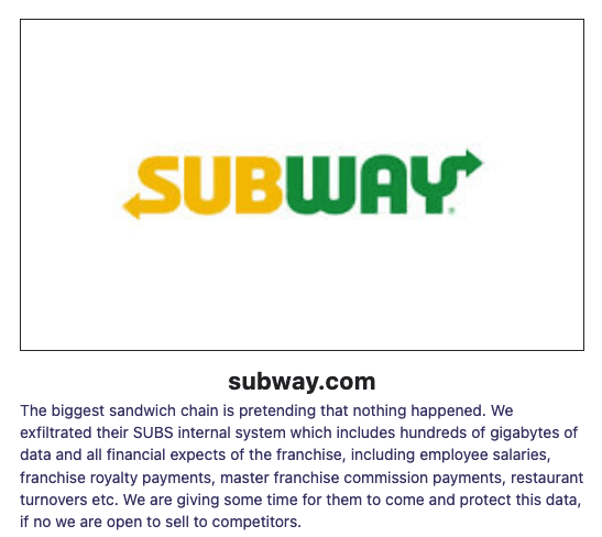 “The biggest sandwich chain is pretending that nothing happened,” the LockBit gang said in a message posted on its website. “We exfiltrated their SUBS internal system which includes hundreds of gigabytes of data and all financial expects of the franchise, including employee salaries, franchise royalty payments, master franchise commission payments, restaurant turnovers etc.”