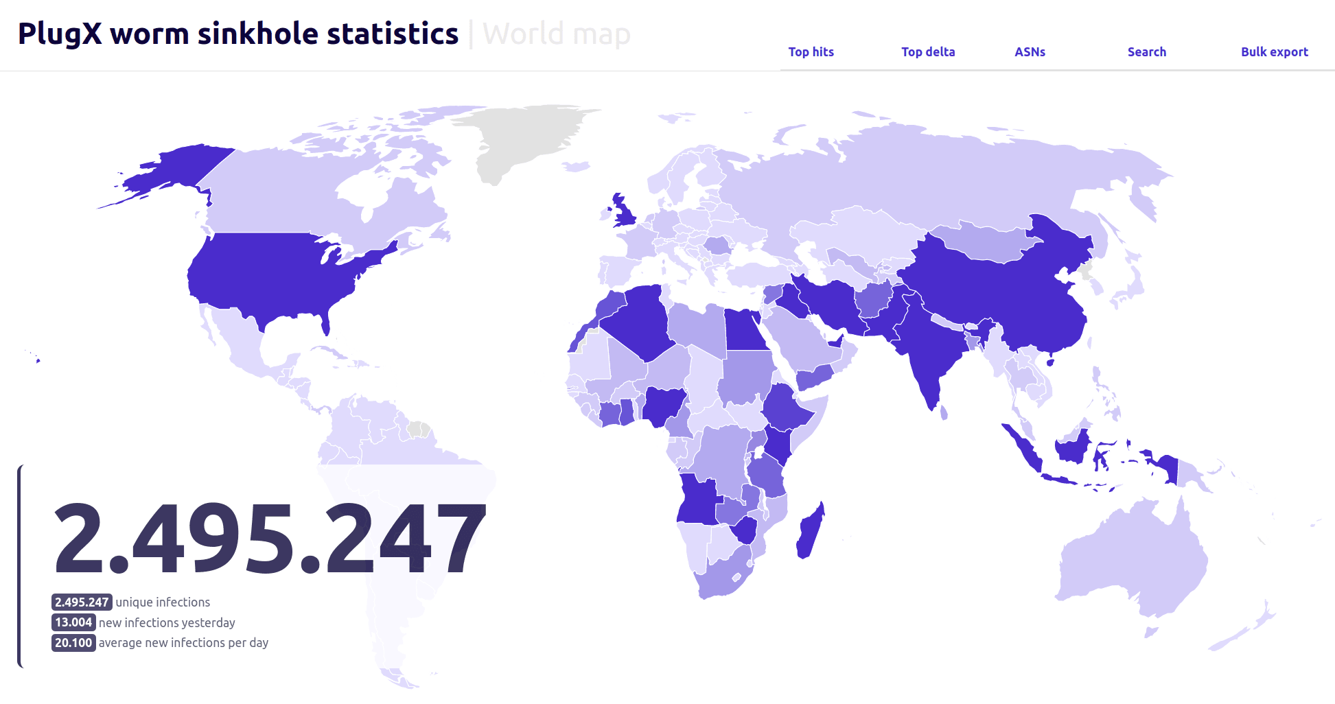 The security firm was able to identify roughly 2.5 million infected hosts in more than 170 countries worldwide, and observed that the worm was still spreading at an average of 20,000 infections per day.