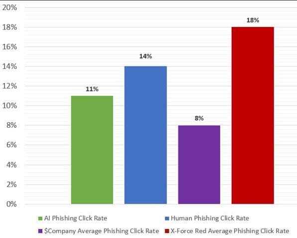 Firstly, the results were close. The human phish achieved a 14% click rate against 11% from the AI phish. Fifty-two percent of the human emails were reported as suspicious, against 59% of the AI emails.