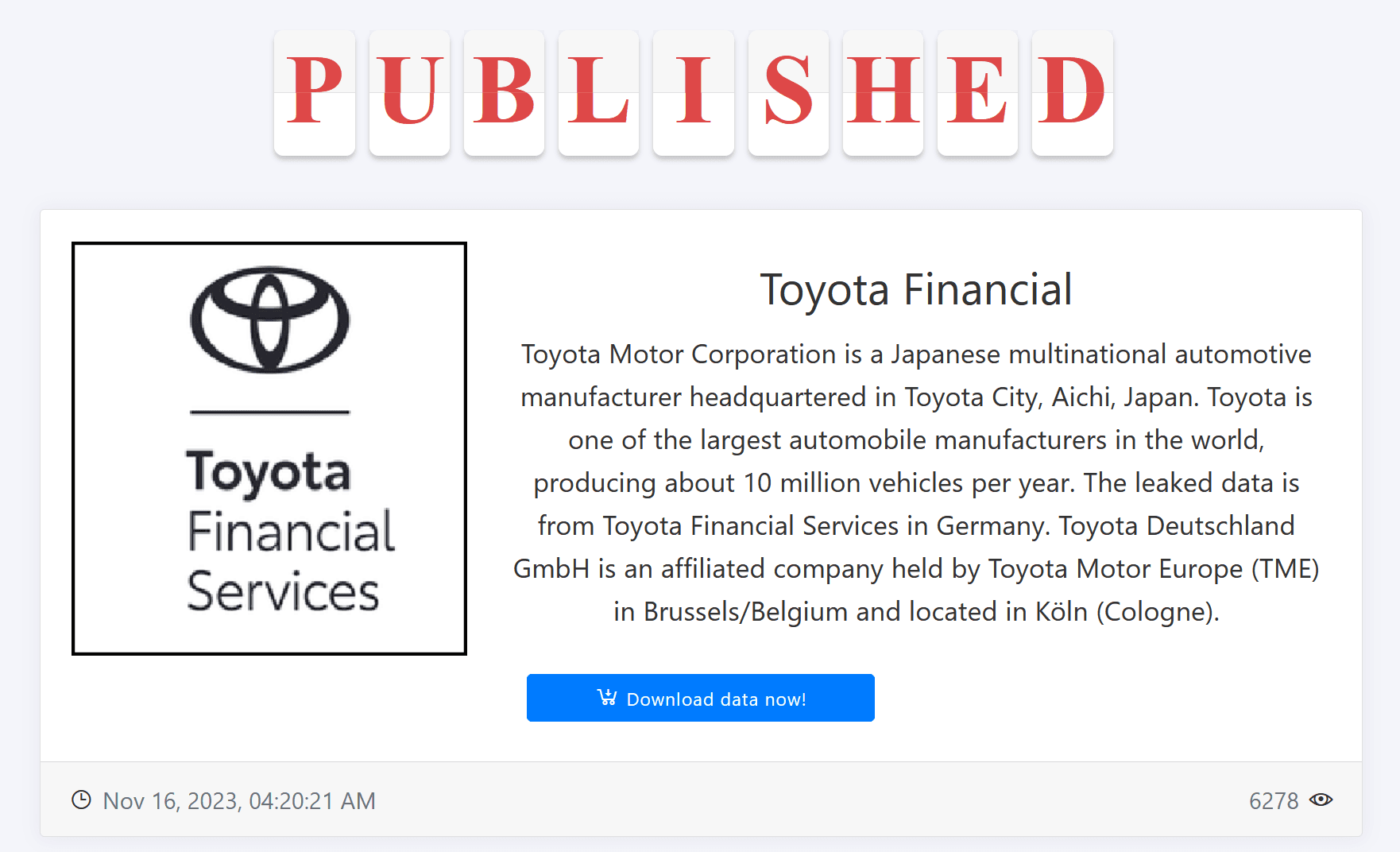 Initially disclosed in mid-November, the incident impacted the systems of Toyota Financial Services Europe & Africa, a subsidiary of the Japanese carmaker.