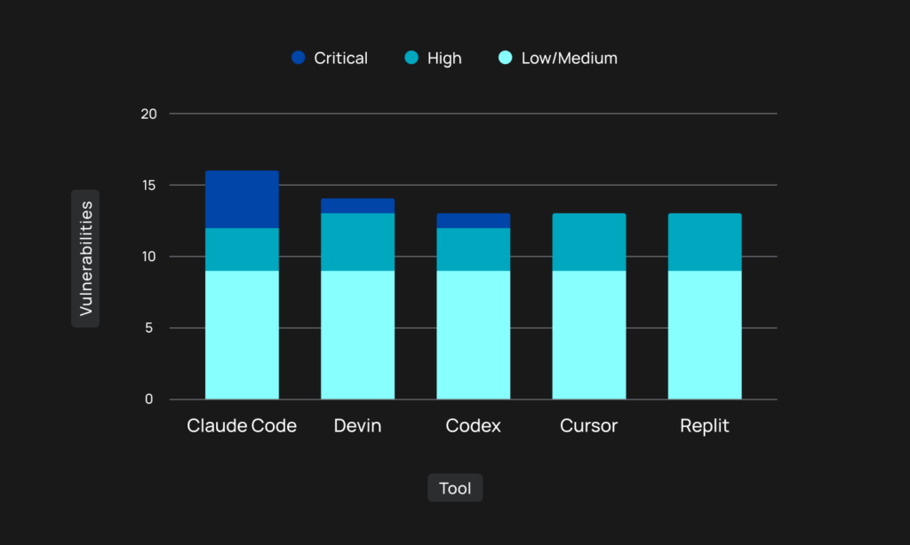 Each agent was tasked with building the same three apps from identical prompts in identical circumstances – and the 15 outputs were compared. Tenzai found a total of 69 vulnerabilities, ranging in severity from critical through high to low or medium.