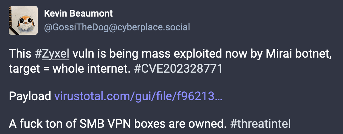 Researcher Kevin Beaumont reported on Thursday that CVE-2023-28771 has been ‘mass exploited’ by a Mirai botnet variant, with many SMB appliances being impacted.